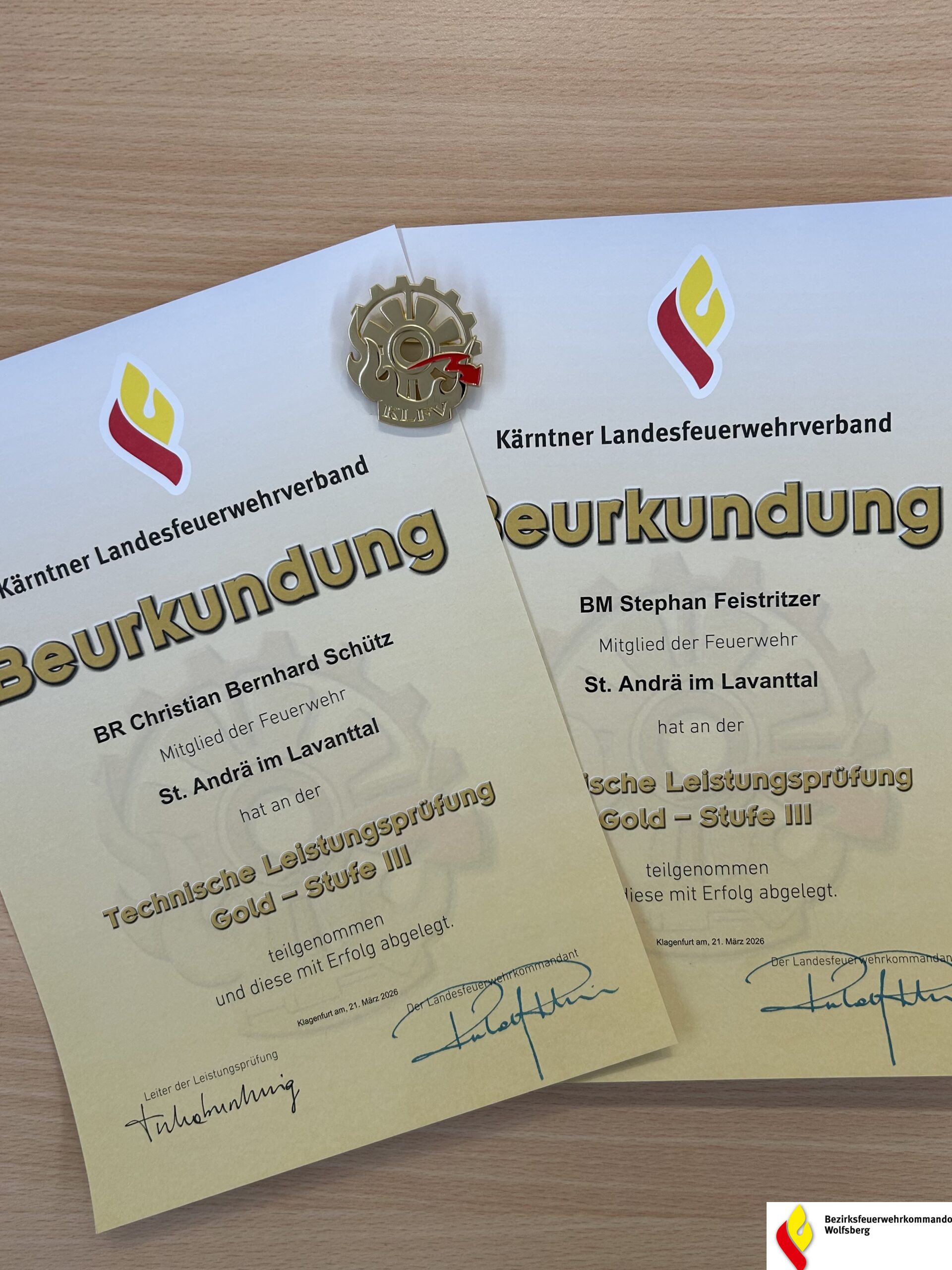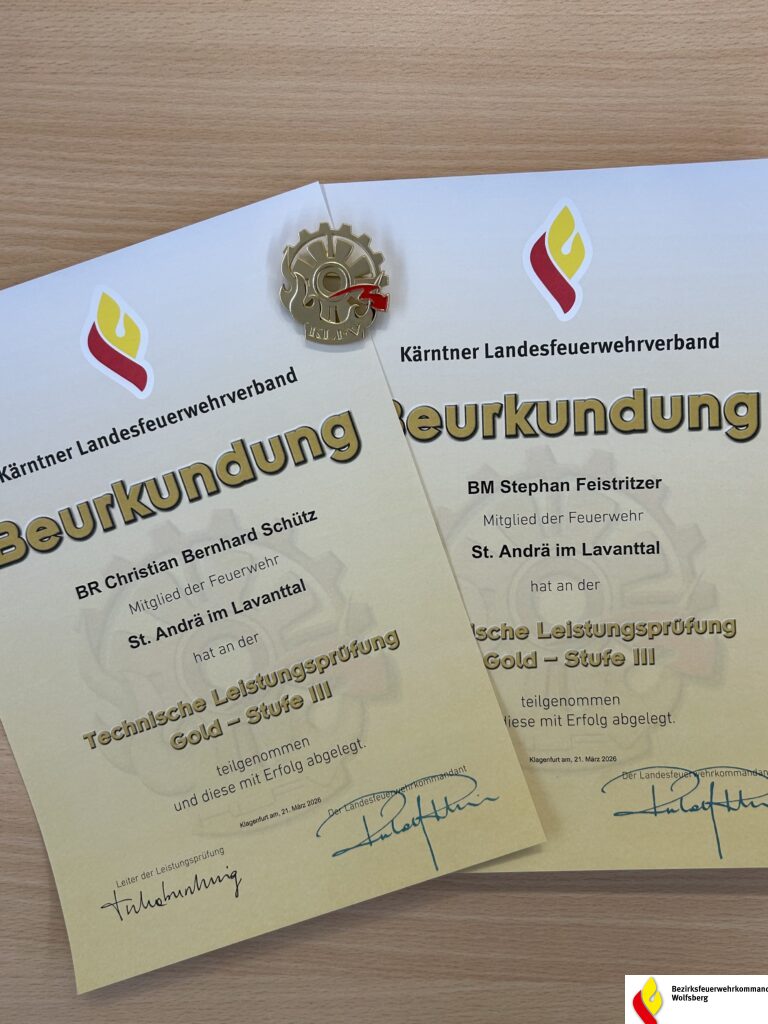 Am 21. März 2026, fand erstmalig in Kärnten die Technische Leistungsprüfung in Gold statt. Die beiden Kameraden BR Christian Schütz und Bm Stefan Feistritzer der FF St. Andrä stellten sich dieser anspruchsvollen Herausforderung und absolvierten die Prüfung erfolgreich.